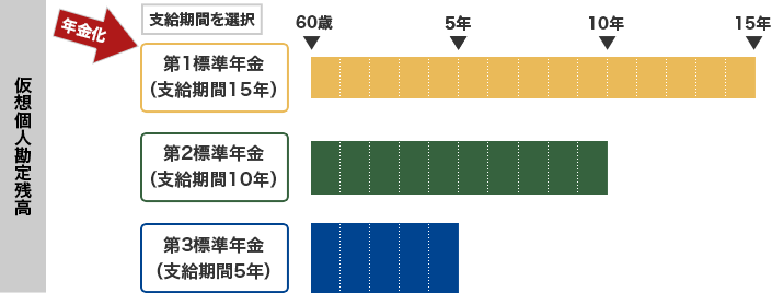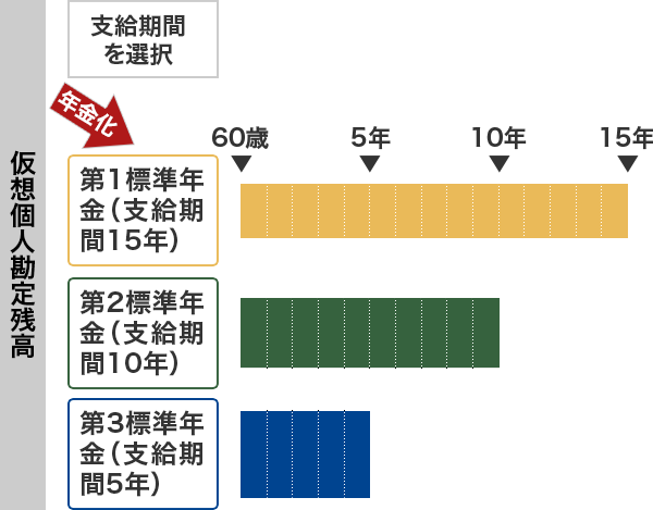 年金額は、年金支給開始時の仮想個人勘定残高を、選択した支給期間によって異なる年金現価率で割った額となります。