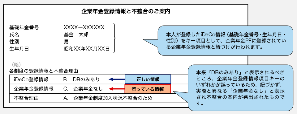 国民年金基金連合会から「企業年金登録情報との不整合のご案内」が届く場合は、①企業年金プラットフォームに登録されている企業年金登録情報が誤っている場合、②本人がiDeCoに登録したiDeCo登録情報が誤っている場合があります。