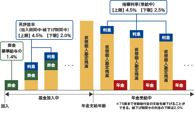 基金は、「キャッシュバランス・プラン」というしくみで設計されています。キャッシュバランス・プランは、積み立てられた標準掛金に、国債などの利回りを指標利率(再評価率)とした利息を加えて、将来、年金または一時金として支給する制度です。積み立てられた給付原資を「仮想個人勘定残高」といいます。利息計算のもとになる指標利率(再評価率)は毎年度変動しますが、上限と下限が設けられているため、利息は一定利率が保証されており、いわゆる「元本割れ」の心配はありません。