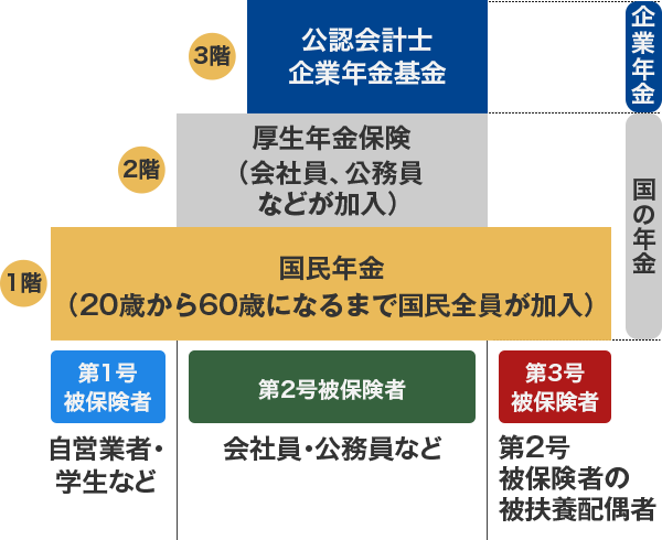 みなさんが加入する年金制度は、下図のように3階建ての構造になっています。
